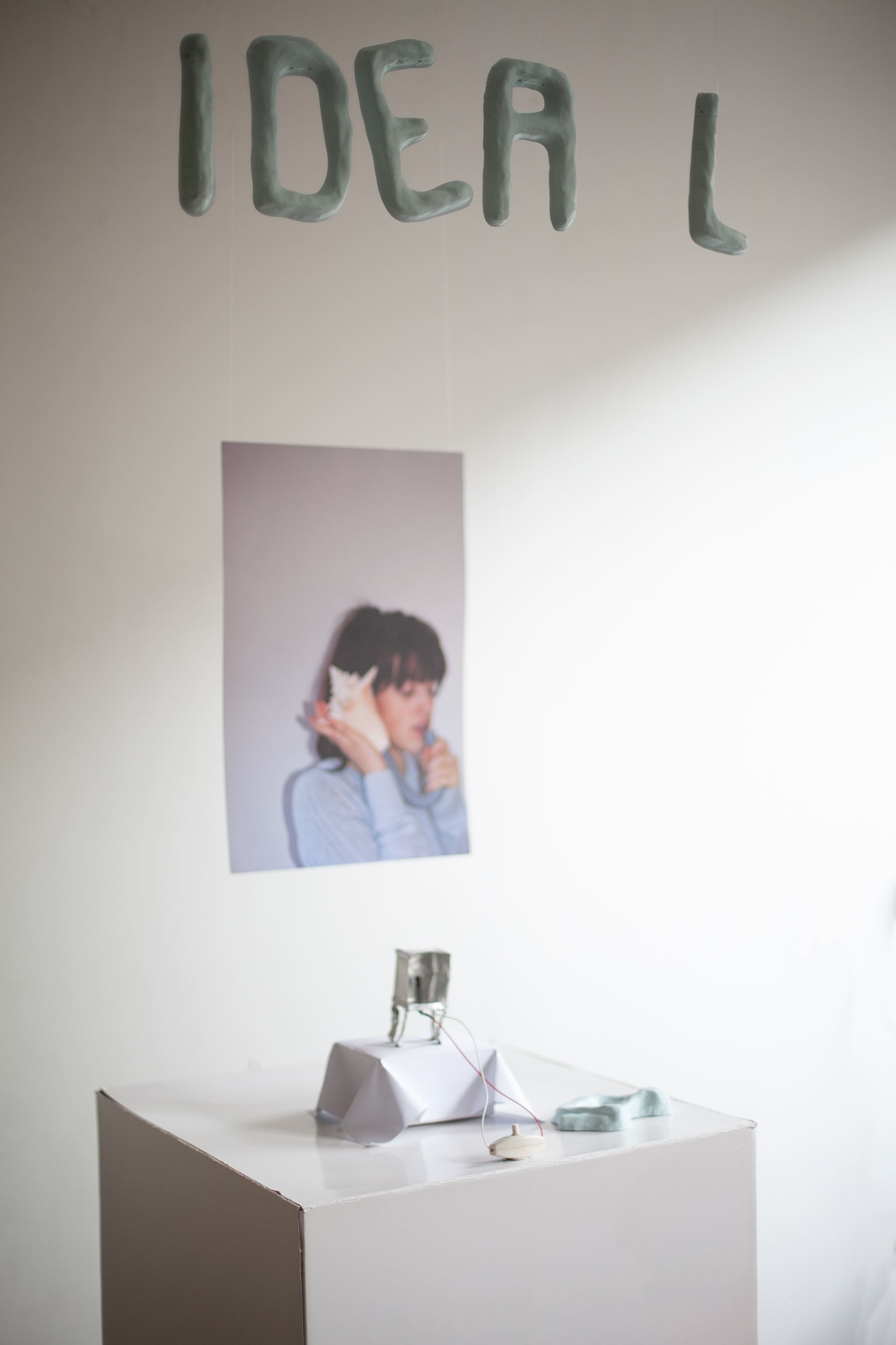 The installation consists of three works; ‘Ideaal’, a design of ceramic letters of which one ‘a’ has fallen down. The work ‘lampje’ which is a product that looks like a little lamp, with an inviting button in front of it. And a self-portrait titled ‘Bericht aan’.